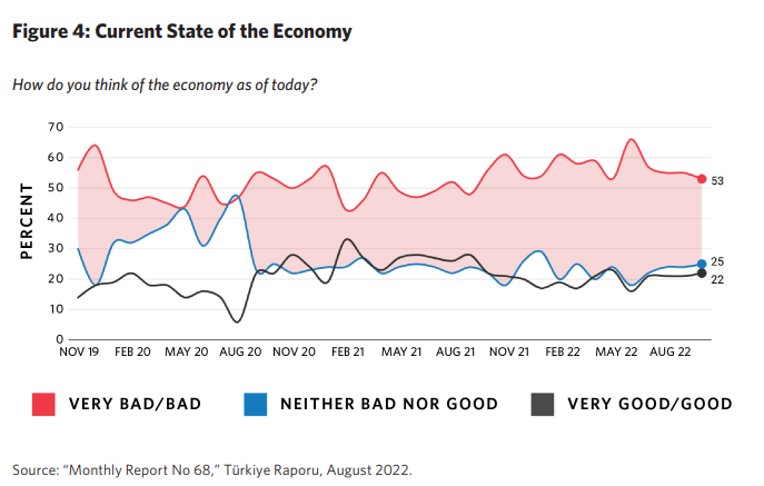 Unanchored inflation undermines the standard of living of ordinary citizens. Perceptions about the state of the economy, as illustrated by the polling of Türkiye Raporu, have consequently worsened to unprecedented levels, with 53 percent of the population stating that the economy was “bad” or “very bad.”