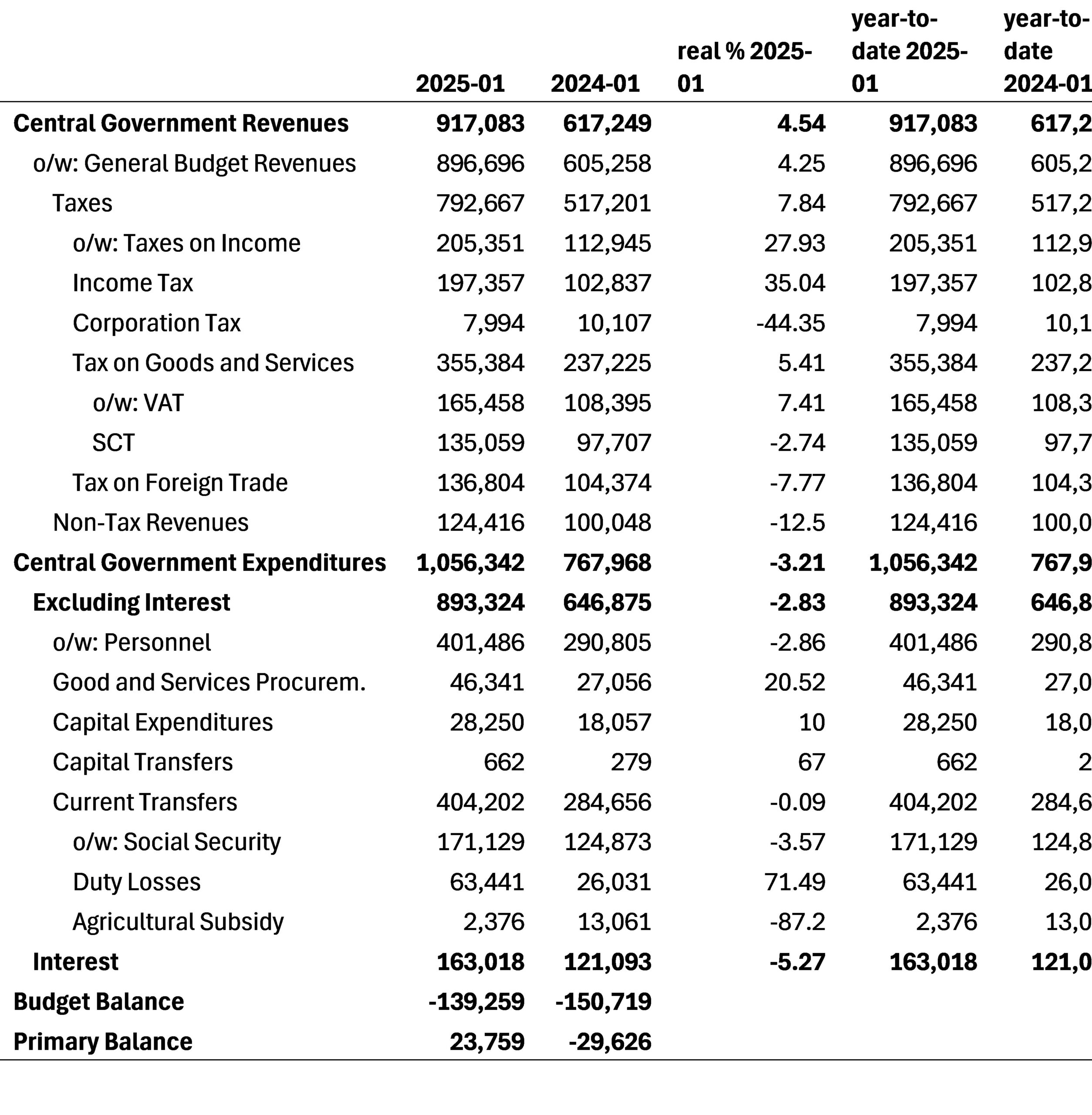 Ministry of Treasury and Finance announced the Central Government budget figures for the first month of the year. Accordingly, central government budget posted a 139.3 billion TL deficit in January, an improvement from the 150.7 billion TL deficit posted in the same month last year. Over the past 12 months, the cumulative budget deficit declined to 2.095 trillion TL, or 4.6% of GDP. The government expects the 2025budget deficit to reach 1.93 trillion TL, equivalent to 3.1% of GDP as per the latest Medium-Term Economic Program (MTP).