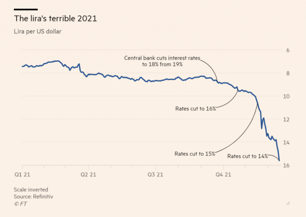 The Turkish lira had plunged on Monday to an all-time low of 18.4 to the dollar, following a months-long slide due to unorthodox interest rate cuts and fears of an inflationary spiral.