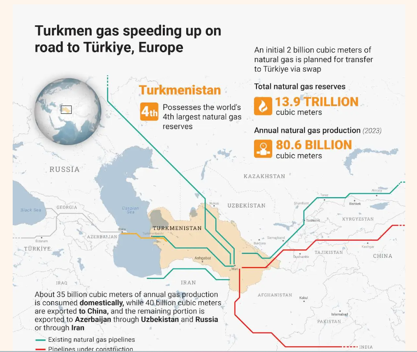 An alternative pipeline route via the Caspian Sea, through Azerbaijan and Georgia, to Türkiye is currently not on the agenda due to high costs and political challenges created by Russia and Iran.