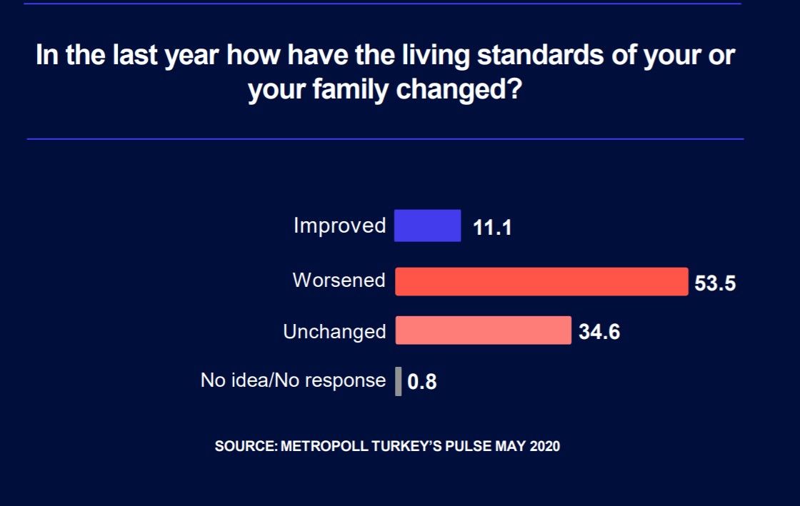 One of the leading social polling agencies, Metropoll has released part of its “Turkey in May” survey to the public through twitter, which makes fascinating but sad reading. The agency finds that 54% of the society assert the welfare of themselves and their families has worsened. In its press release to Turkish press, the agency determined that substantial changes in voting pattern took place in the month. AKP seems to be the loser.