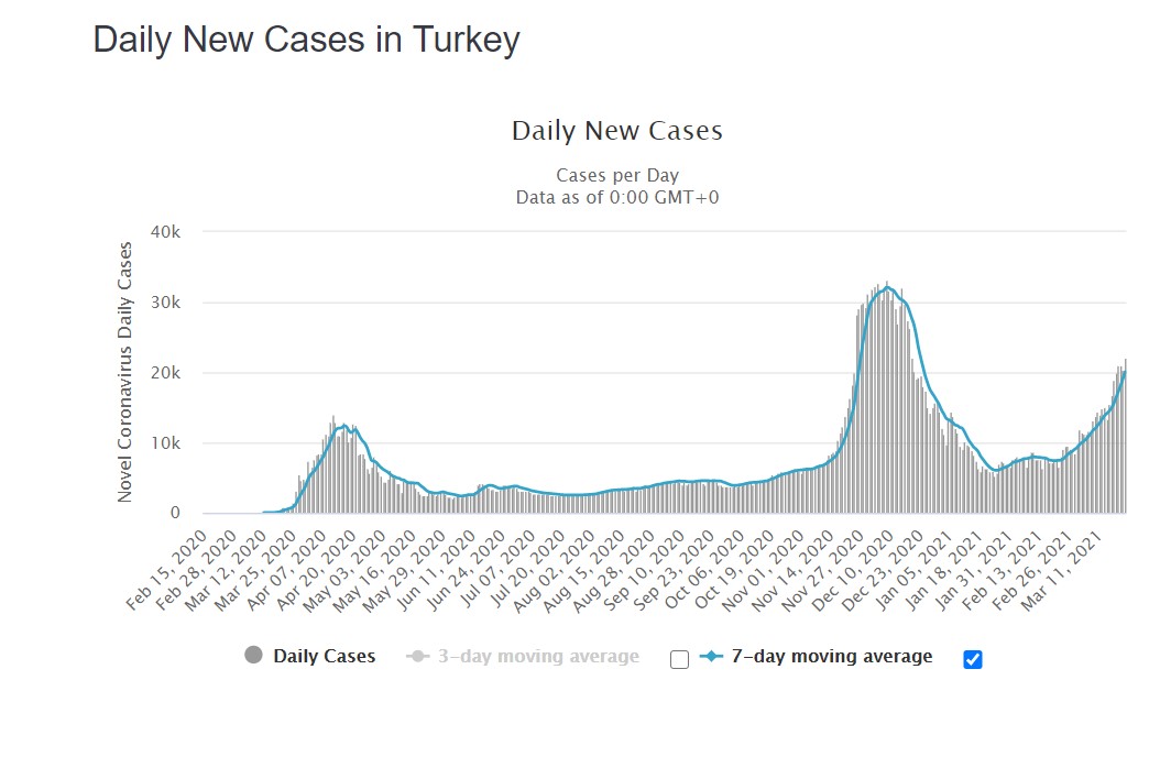 However, with only 14 mn citizens out of 85 mn receiving at least one dose of Sinovac vaccine and supplies running out fast, there is no simple way to eradicate the virus without a national lockdown. The cost are daunting either way. The budget doesn’t have the funds to compensate small businesses and unemployed workers in case of a lockdown. Keeping the economy open runs the risk of run-away infections durign the summer, jeopardizing the all important tourism season. According to Ministry of Health, Turkey will not reach herd immunity before the end of 2021.