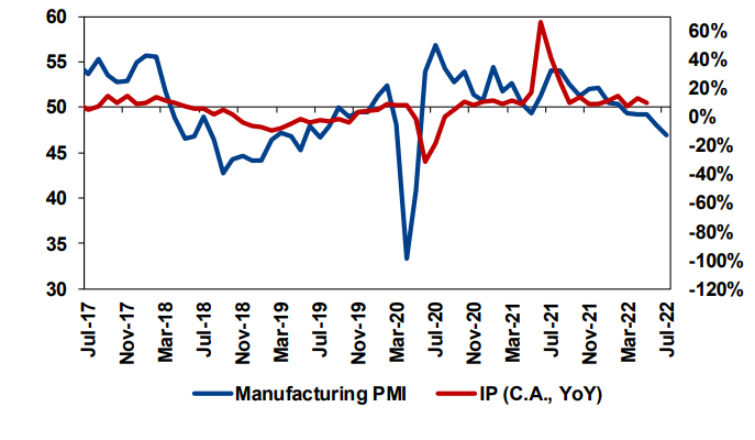Manufacturing PMI indicate that the YoY IP could lose momentum and decrease to negative levels.