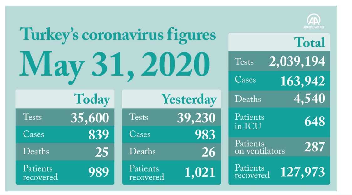 Turkey reported a total of 839 new cases, bringing the infection tally to 163,942, Koca added.